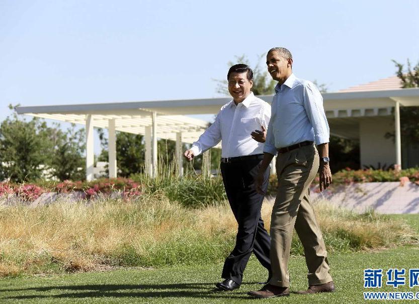 当地时间6月8日上午,中国国家主席习近平同美国总统奥巴马在美国加利福尼亚州安纳伯格庄园举行第二场会晤。会晤开始前,习近平和奥巴马在风光秀丽的庄园内散步,在轻松的气氛中交谈。这是散步途中,奥巴马将加利福尼亚州红杉木椅赠送给习近平