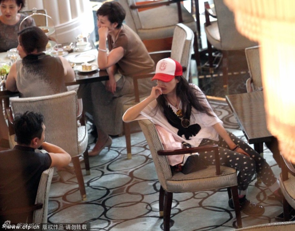 舒淇戴红色棒球帽约友人喝下午茶