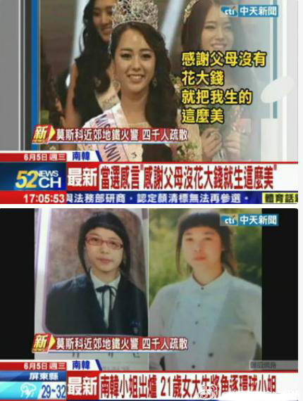 当地时间2013年6月4日,韩国首尔,2013韩国小姐大赛决赛举行,21岁的大学生刘艺彬当选今年的韩国小姐,她将代表韩国参加今年的环球小姐大赛。但很快就有网友翻出了这位新晋韩国小姐冠军的旧照,照片中的她大概十几岁,留着齐刘海,其中有一张戴着眼镜,看上去眼睛细小、鼻梁塌、脸盘非常圆,是非常典型的韩国人长相。虽然旧照中的她看上去也不乏清秀,但跟现在大眼睛、高鼻梁、锥子脸的模样简直是判若两人。网友调侃:“岁月这把杀猪刀,终于抵不过手术刀。”
