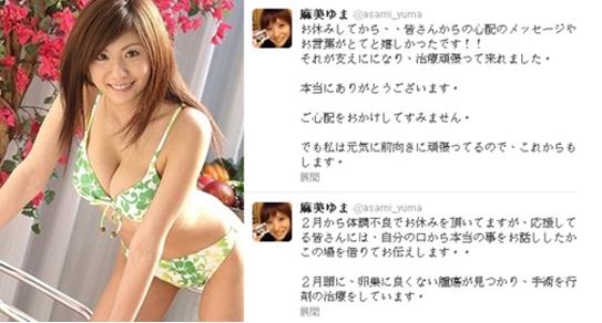 麻美患癌的消息已经在网上疯传,好多男网友纷纷发出慰问,麻美之前已经消失过一阵子,直至4月初她再现身,突然激瘦,于是传言四起。